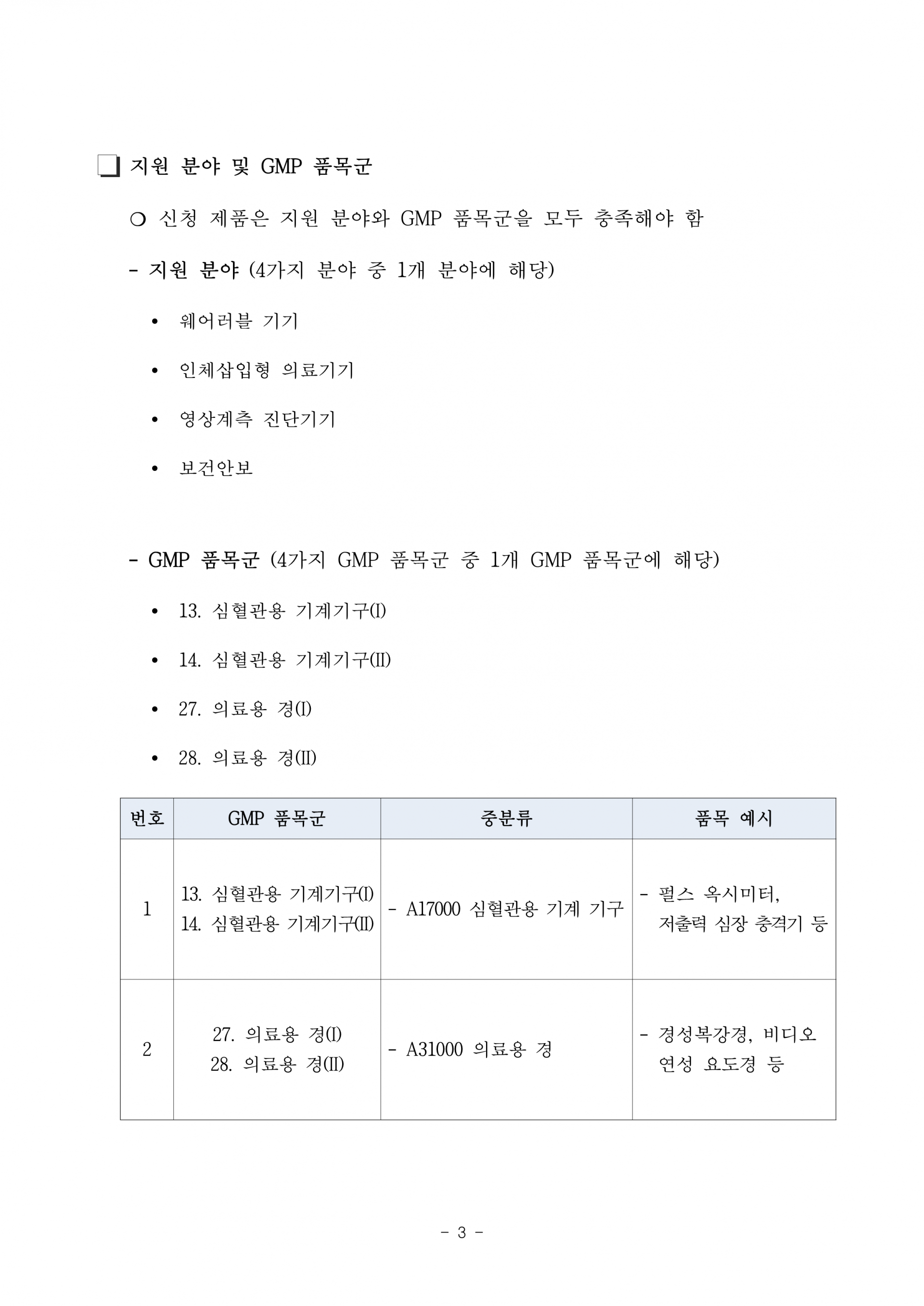 - 신청제품은 지원분야와 GMP 품목군을 모두 충족해야 함