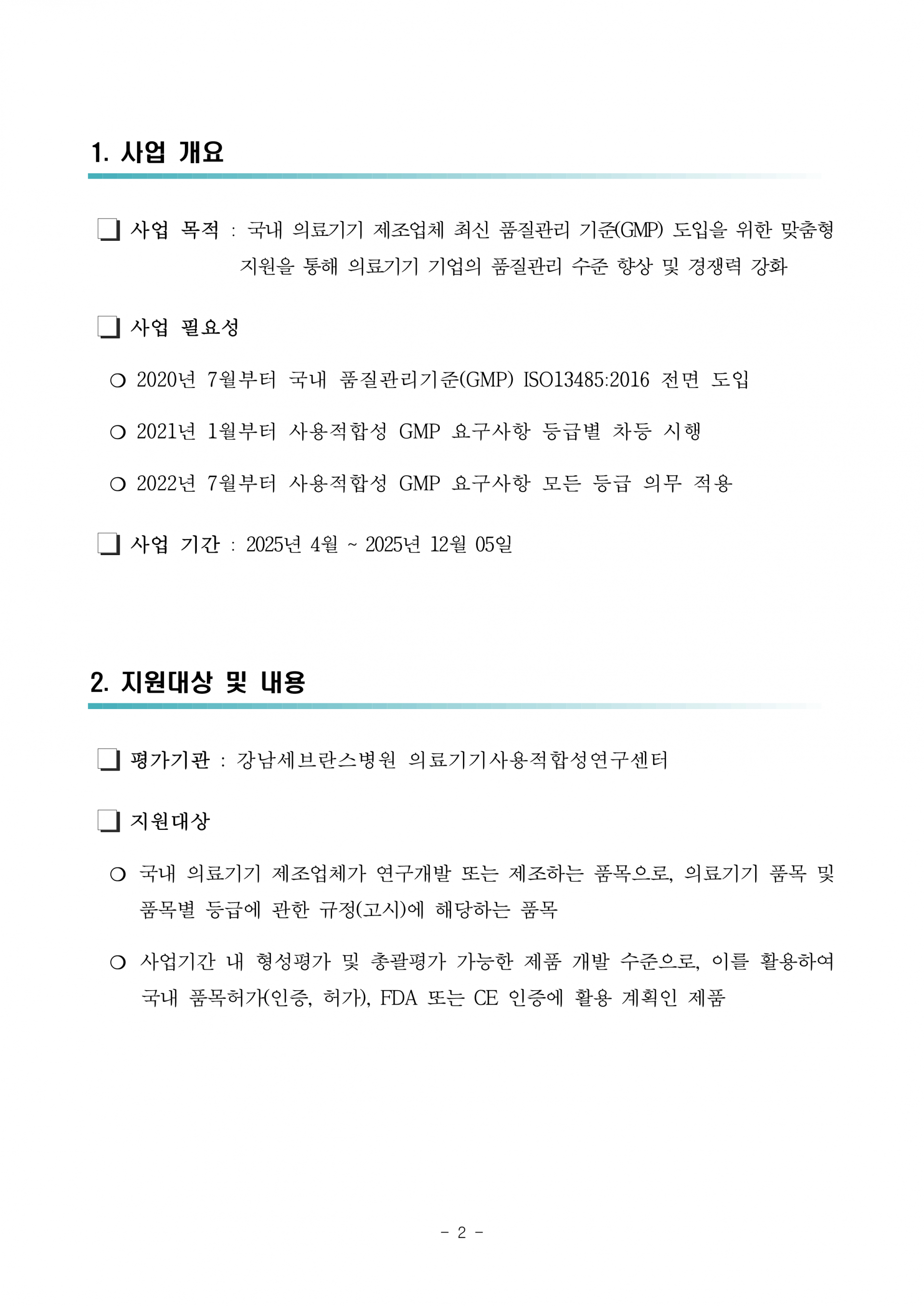 ○ 사업목적 : 국내 의료기기 제조업체 최신 품질관리 기준(GMP) 도입을 위한 맞춤형 지원을 통해 의료기기 업체의 품질관리 수준 향상 및 경쟁력 강화