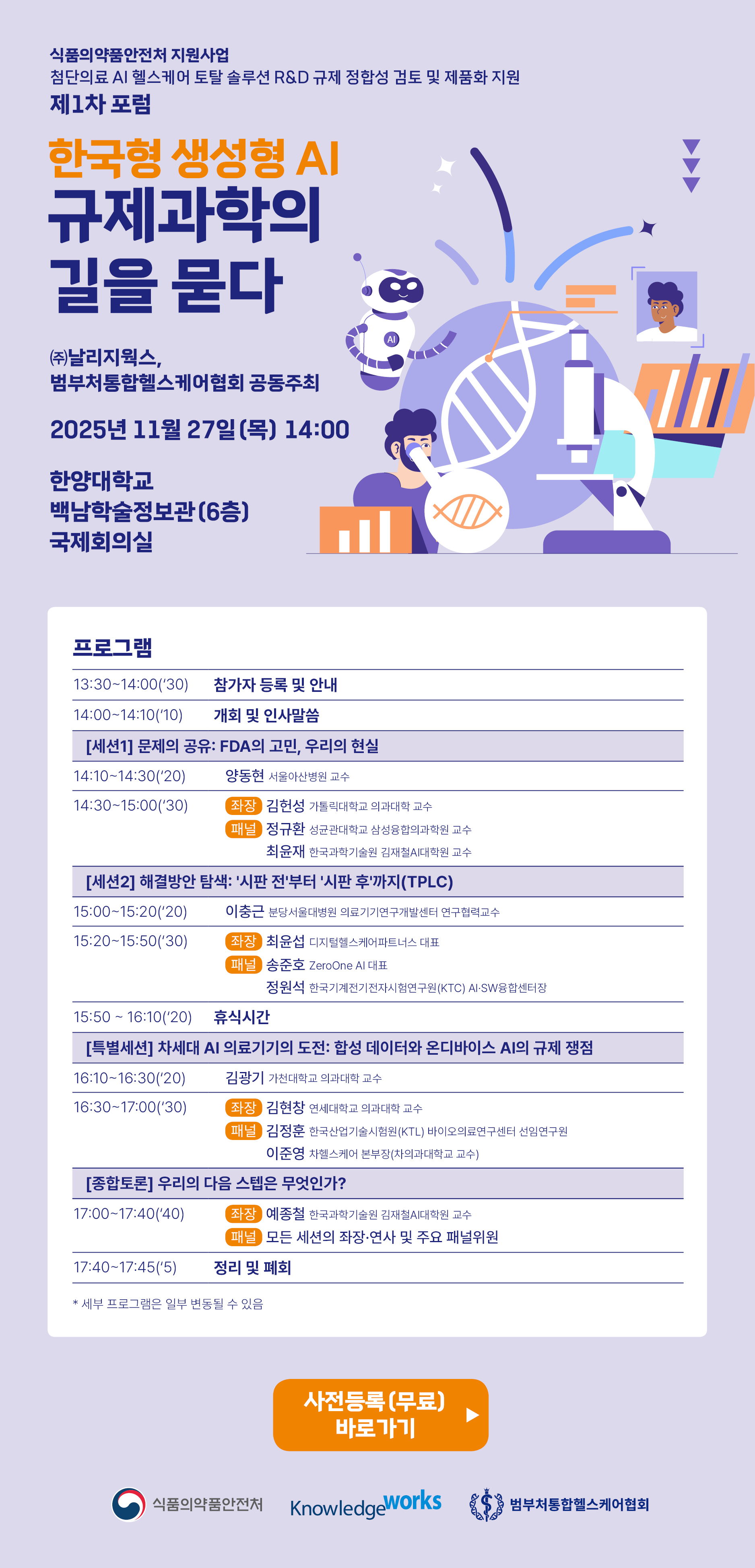 이번에 날리지웍스와 범부처통합헬스케어협회가 공동 주최로 제1차 포럼 <한국형 생성형 AI 규제과학의 길을 묻다>를 개최합니다.